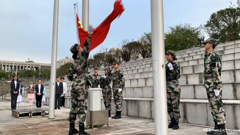 国旗队踏着铿锵的步伐护送国旗入场,伴随着雄壮激昂的《义勇军进行曲》,五星红旗冉冉升起,全体师生面向国旗行注目礼,齐唱国歌。