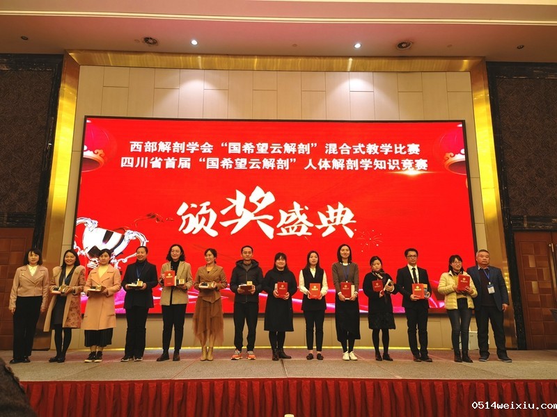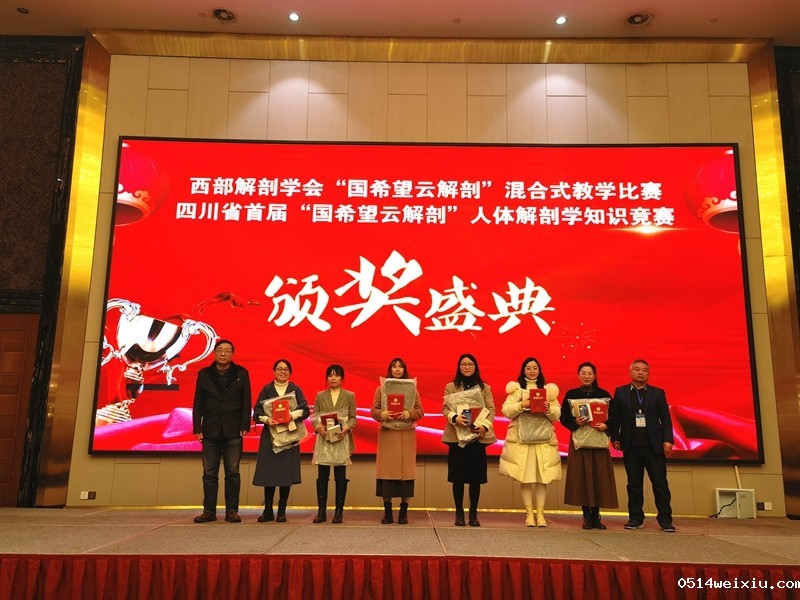本次年会还为前期举行2021年四川省首届“云解剖”人体解剖学知识竞赛获奖院校和优秀学生颁发奖牌和荣誉证书,学院取得了四川省首届“国希望云解剖”人体解剖学知识竞赛高职组团体第一名,秦治杨等11位同学分获个人一、二、三等奖和优秀奖,基础医学部主任钟明代表学院上台领奖。